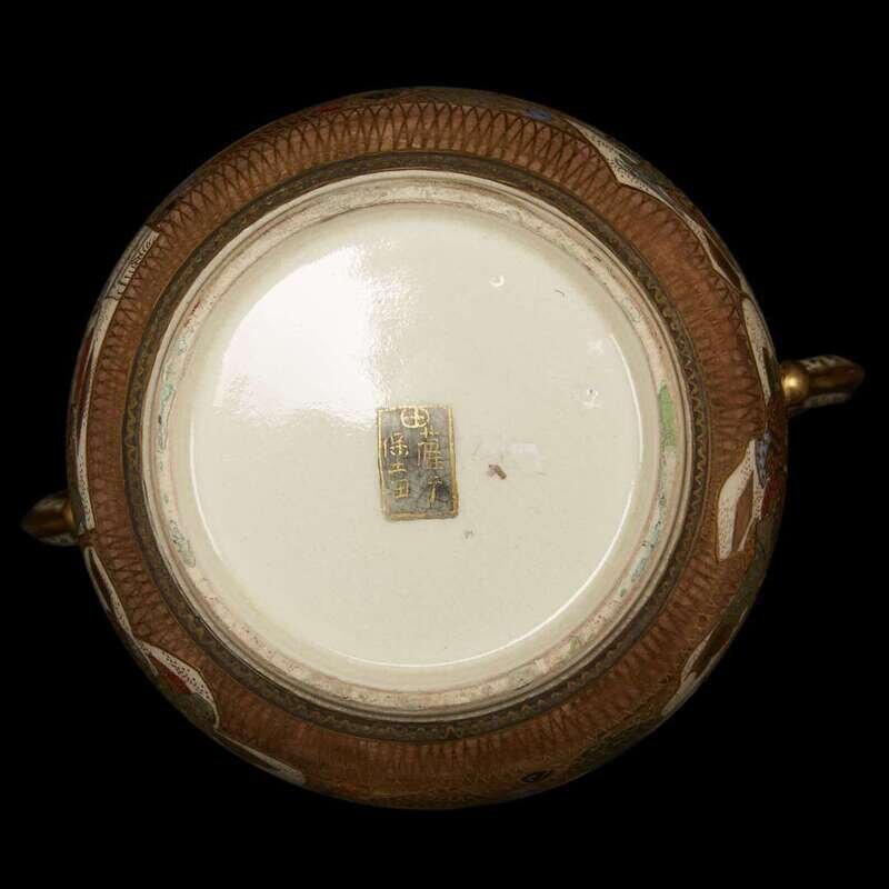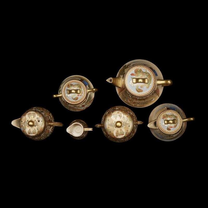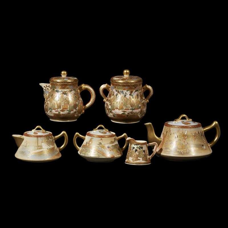 Comprising a three piece teaset; a covered creamer with matching with covered sugar; a small creamer. All signed on underside.