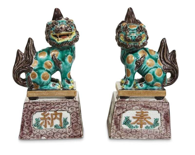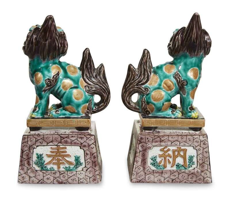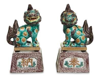 A pair of Japanese enameled porcelain Buddhist lions on stands