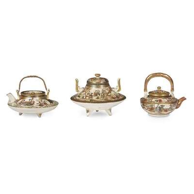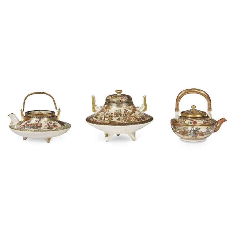 Group of two Satsuma pottery small saki pots and a flared koro meiji period
