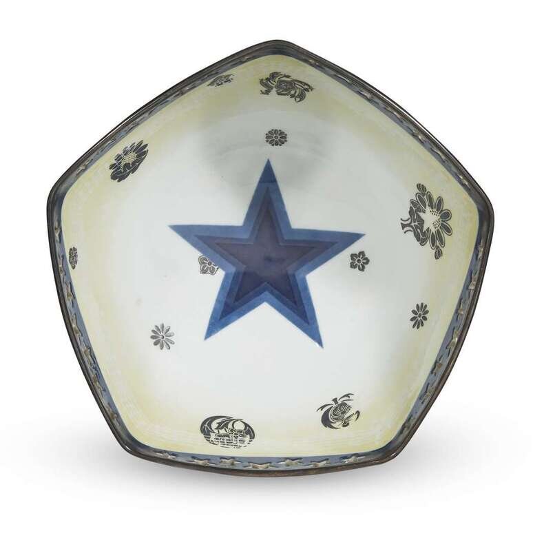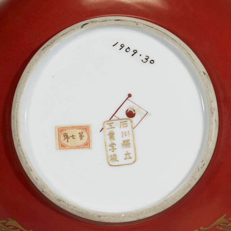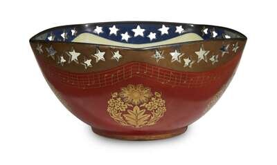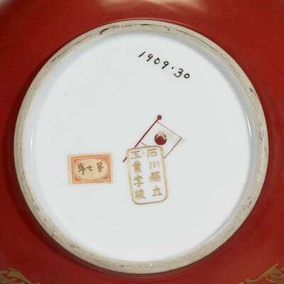 Of pentagonal form, the exterior decorated with gilt floral rondels and musical notations for the Japanese national anthem, on an iron-red ground; the interior decorated with oxidized silver emblems, incised musical notations for the Star-Spangeled Banner on a graded pale yellow ground, centered by a large blue star, the rim pierced with stars, underside inscribed "Ishikawa kenritsu kogyo gakko", and with an inscribed collections number 1910.30.