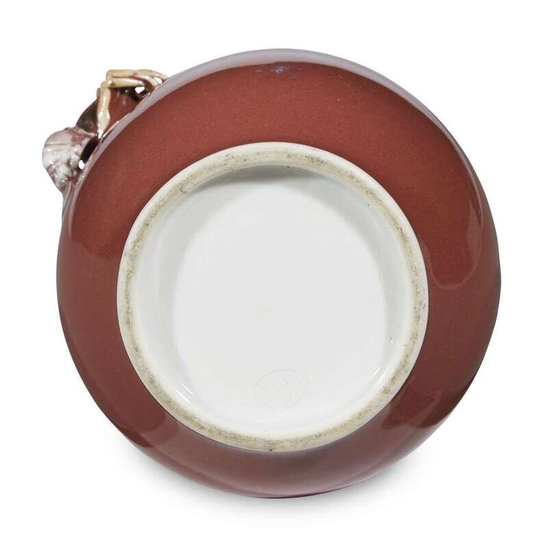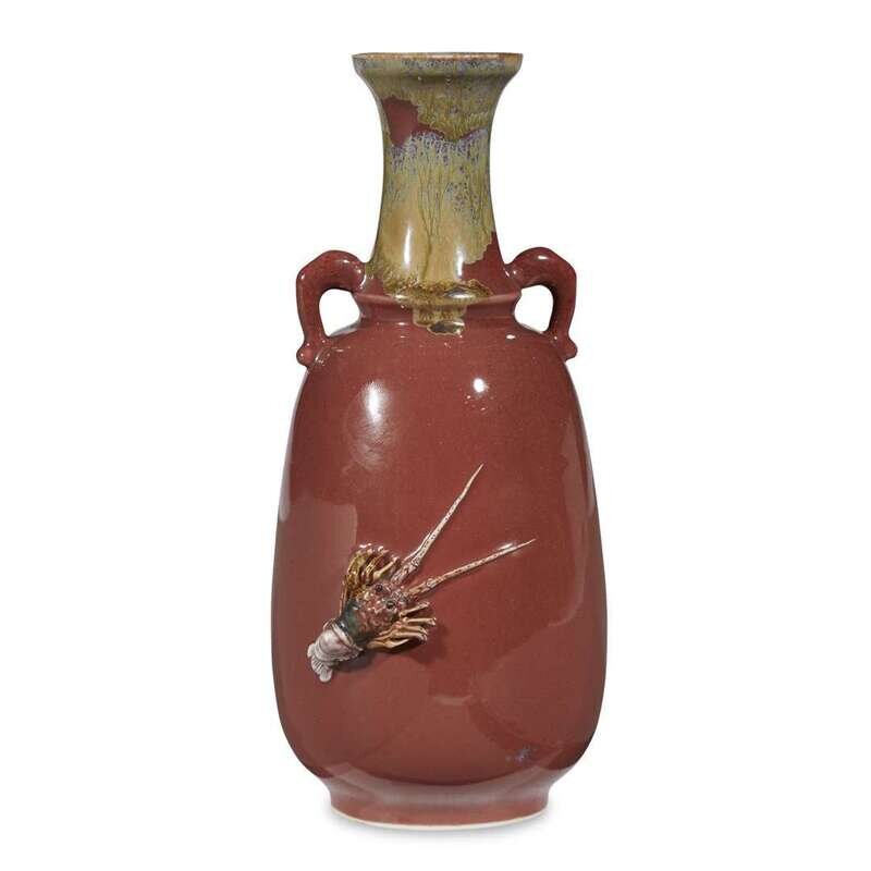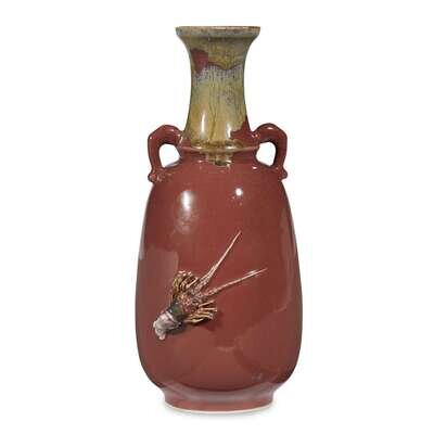 Of elongated ovoid form, the vase with a slightly slender neck tapering to a flaring mouth moulded in relief to the lower body with a stylised crayfish, covered in pomegranate red with light-brown glazed splashes around neck and mouth; underside incised Harubana.