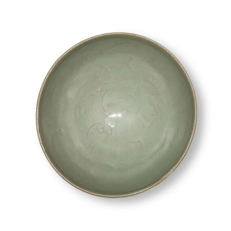 Covered in celadon glaze, interior incised with a floral bloom and combed waves.