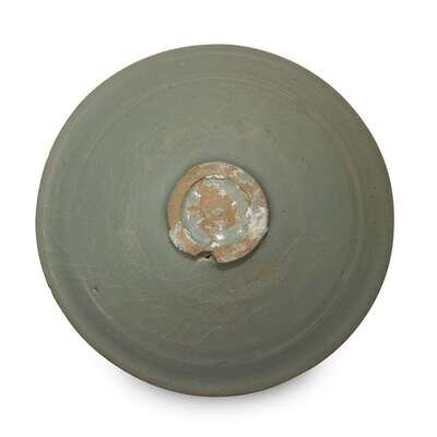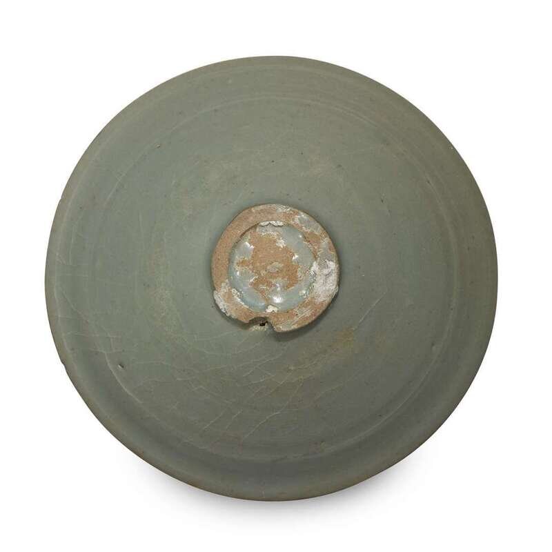 The interior of the lip incised with a single line border, all raised on a short circular foot, the glaze a pleasing grey-green with a pale pattern of craquelure, traces of three spur marks to edge of foot.