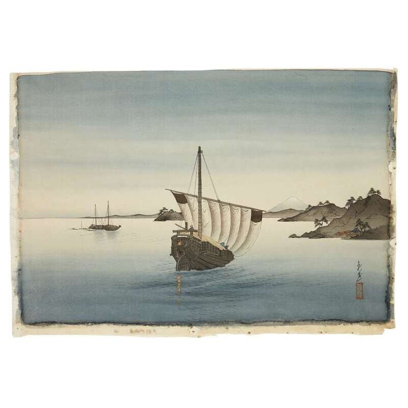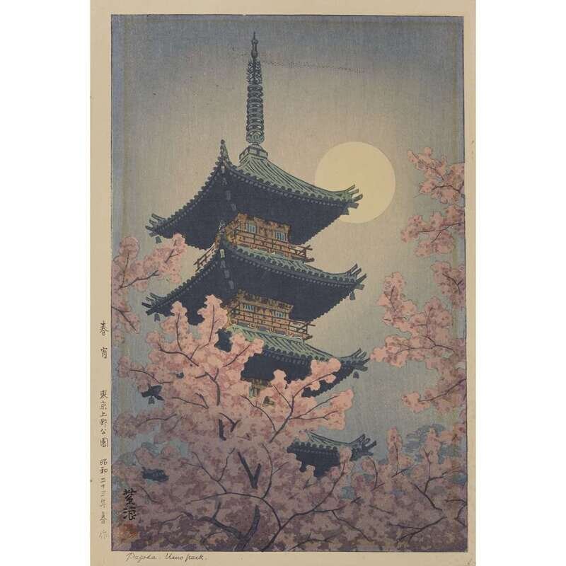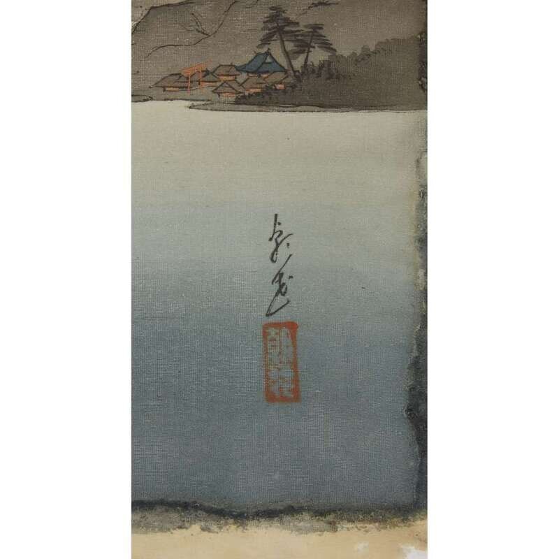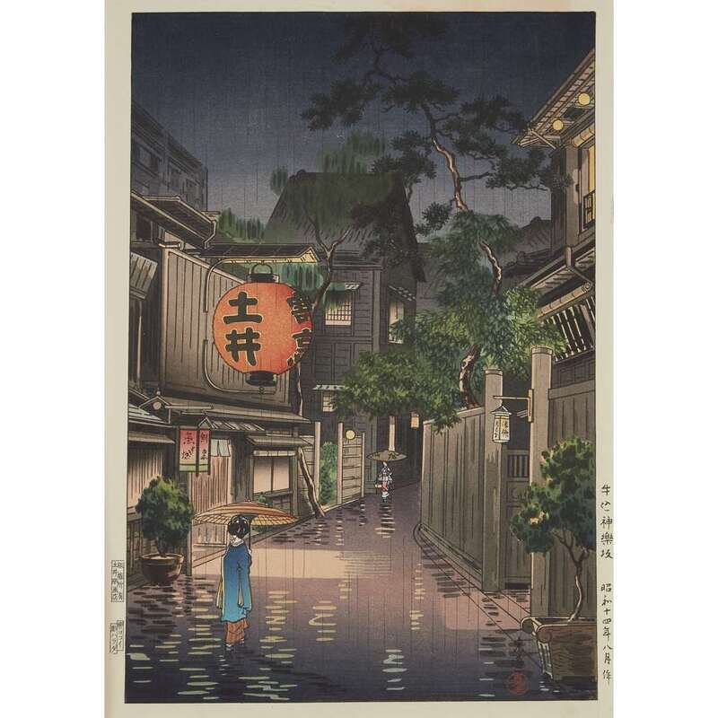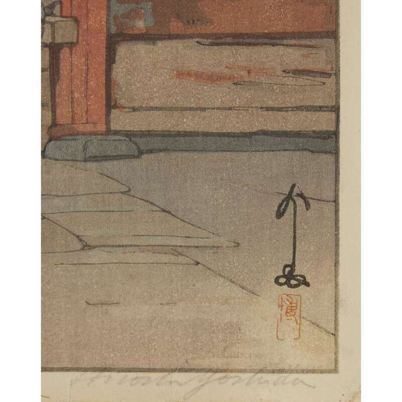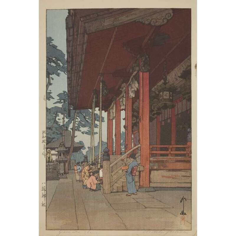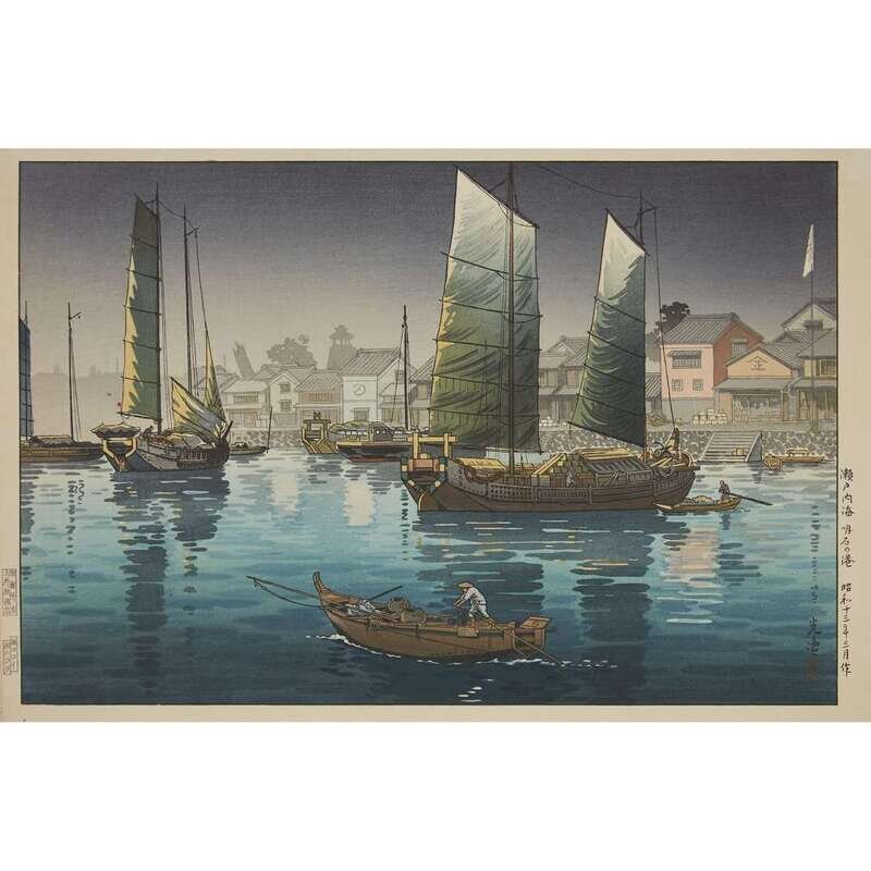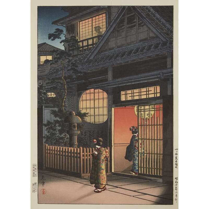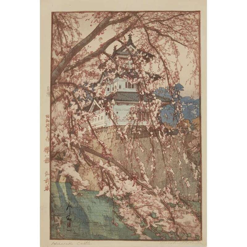 Comprising: Hiroshi Yoshida, Yashaka Shrine, signed in pencil and Hirosaka Castle; Kasamatsu Shiro: Spring Evening at Tokyo Ueno Park; Tsuchiya Koitsu: Teahouse - Yotsuya Arakicho, Evening at Ushigome, and Akashi Port.; and one ink and color on silk, signed approximate sight larger sheet: 15 in., 38.2cm; 10 in., 25.4cm