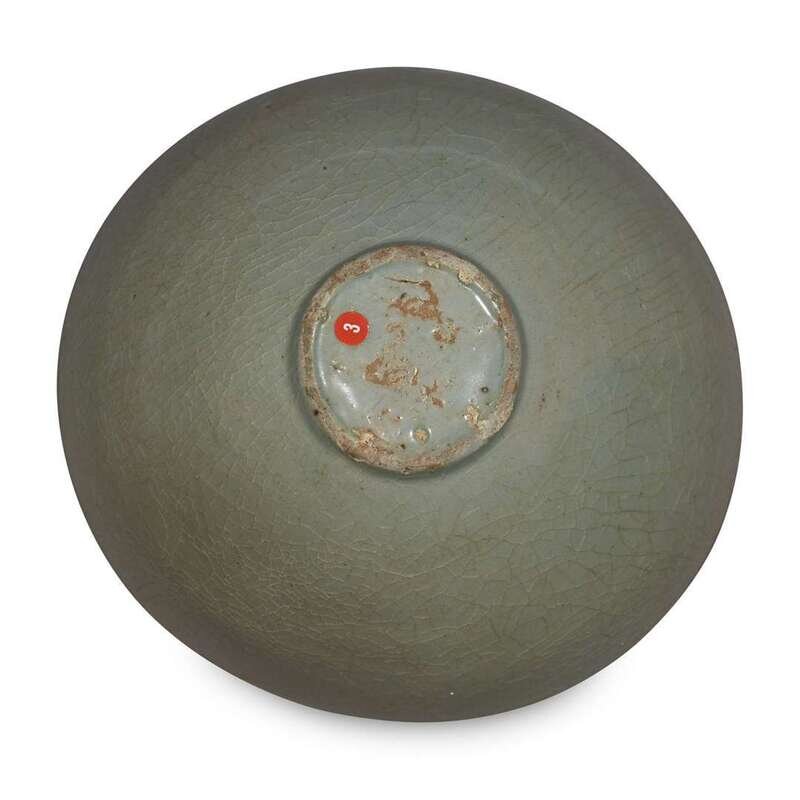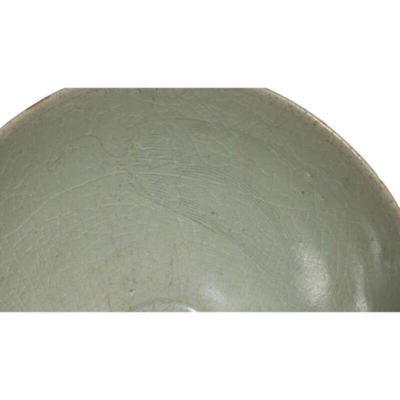 The interior of the rounded bowl on short circular foot, finely-incised with two phoenix (or long-tailed parrots) in flight, among scrolling clouds, the well with stylized buds, a soft grey-green glaze overall, with a fine craquelure, traces of approximately six spur marks to foot ring.