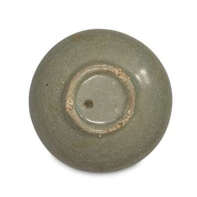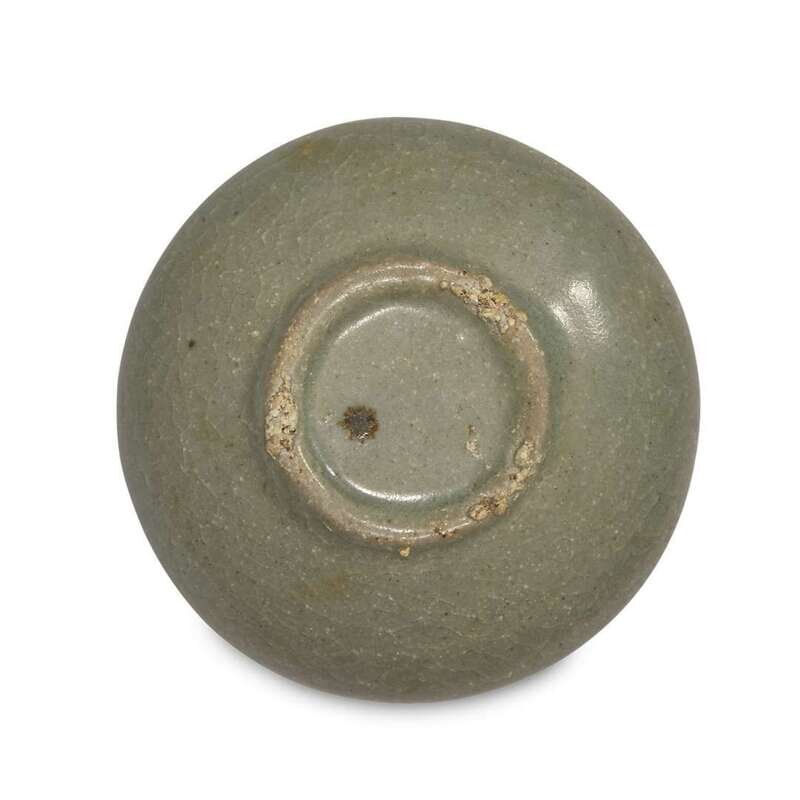 Of compressed globular form with cupped lip, all on a short circular foot, the shoulder inlaid with three cranes and "clouds", grey-green glaze with a fine craquelure, underside with traces of three spurs.