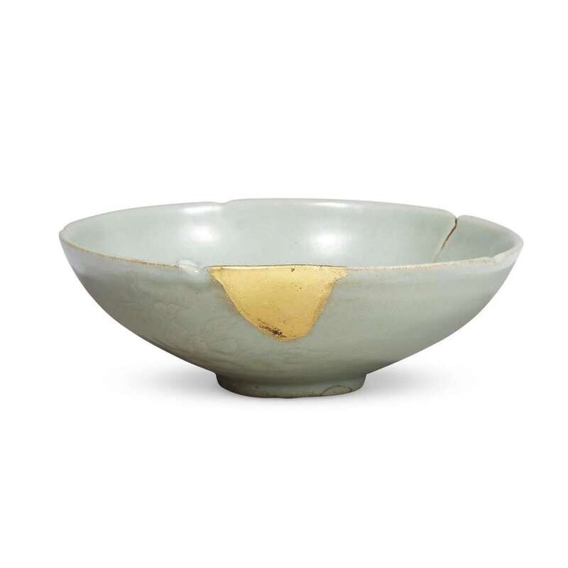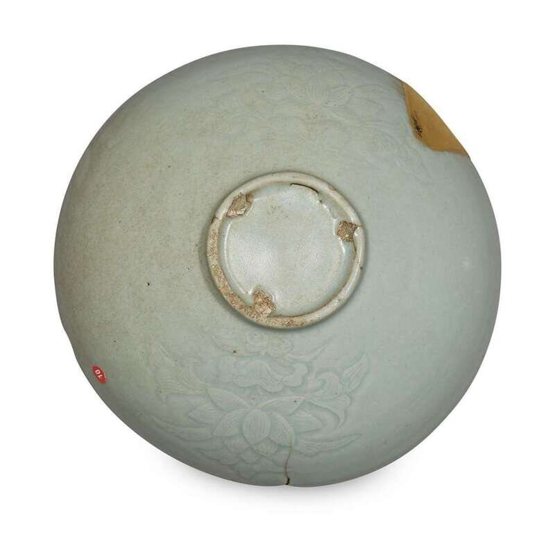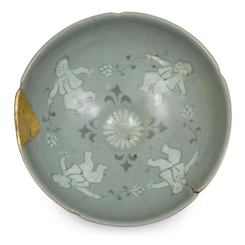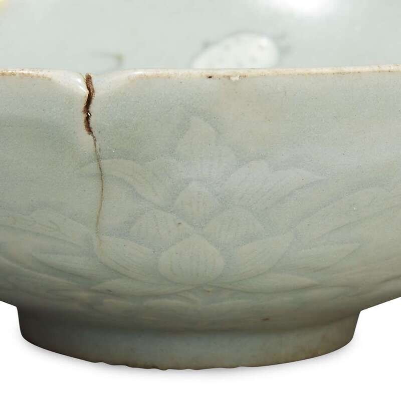The five lobed circular bowl of rounded profile, on short circular foot, the interior inlaid with four boys bearing lotus buds on long stems, centered by a chrysanthemum and foliage, the exterior finely carved with two lotus blossoms and foliage, with a thick, soft grey-green glaze with tinges of blue, underside with three spur marks, gold lacquer repair.