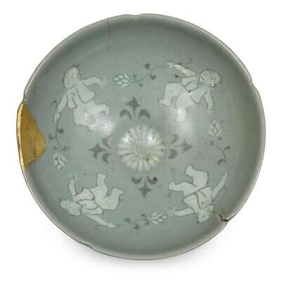 A Korean incised and inlaid celadon "Boys and Lotus" floriform bowl goryeo dynasty, 12th century