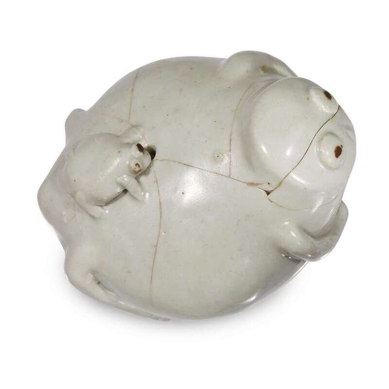 Humourously-modeled, in the form of a swelling frog, a smaller frog on its back, the eyes highlighted with iron brown, the thick glaze with soft surface and a greyish tint.