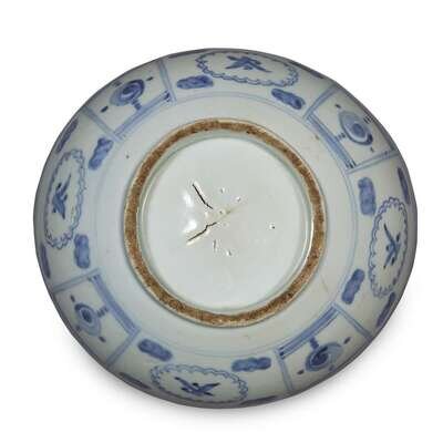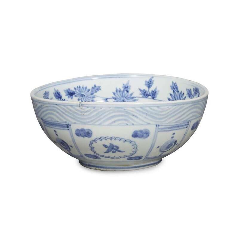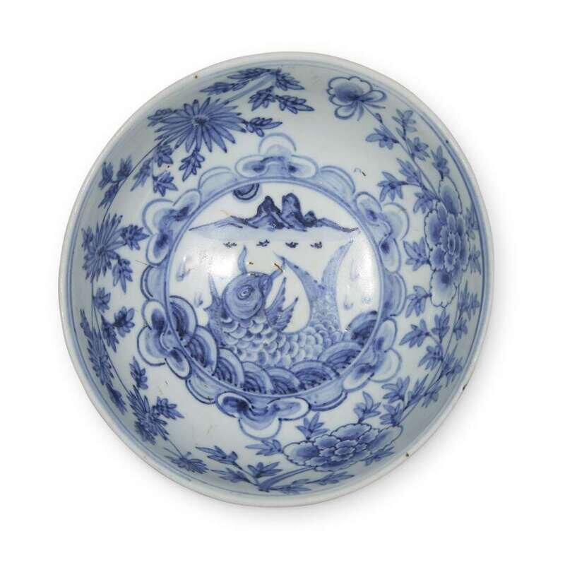 Sturdily potted, with curving sides and a short circular foot, the interior decorated with an arching carp on waves, below a mountain and sun, the cavetto painted with peony and chrysanthemum sprays, the exterior with ornamented panels below a stylized wave border, all under a pale blueish-white glaze, fine kiln sand to foot.