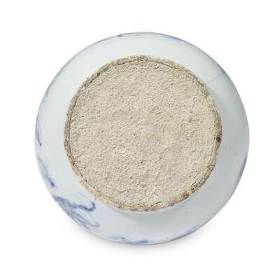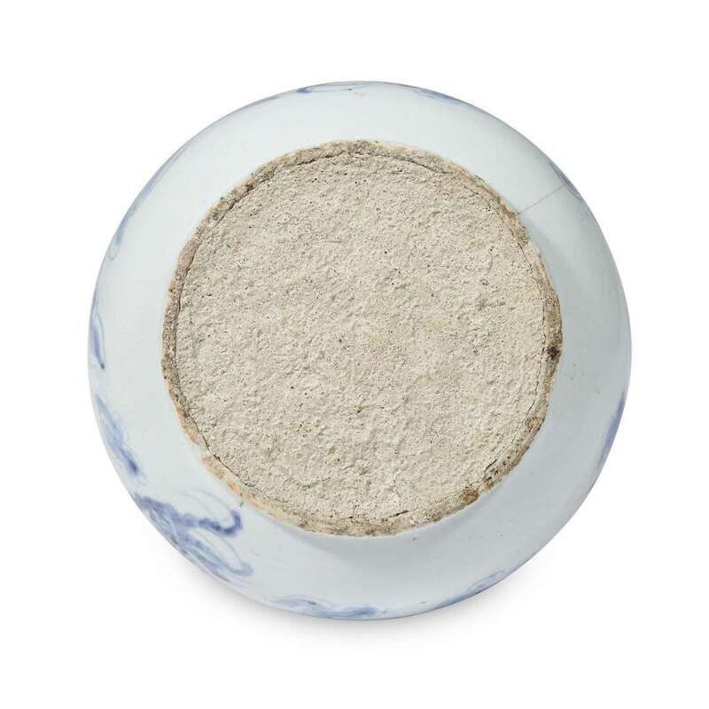 With swelling base and tapered neck, well-painted with a muscular and sinuous four-clawed dragon among clouds, grasping at a flaming pearl, the lustrous, very even glaze with a pale blue tint.