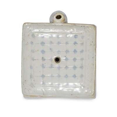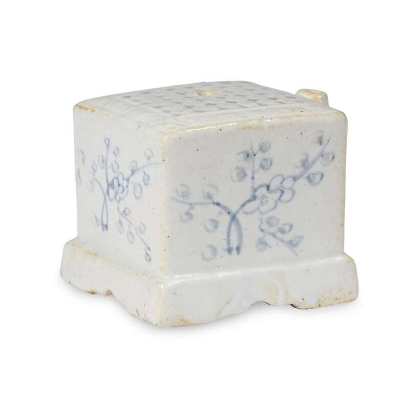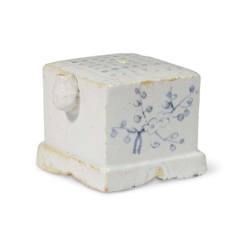 Raised on a molded base, a small curved spout to one side, the pierced top reminiscent of a weiqi board, bordered by incised lappets, three sides decorated in pale blue with prunus sprays, the slightly opaque glaze with a pale blue-grey tint, underside with traces of kiln grit and sand.