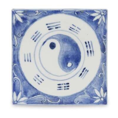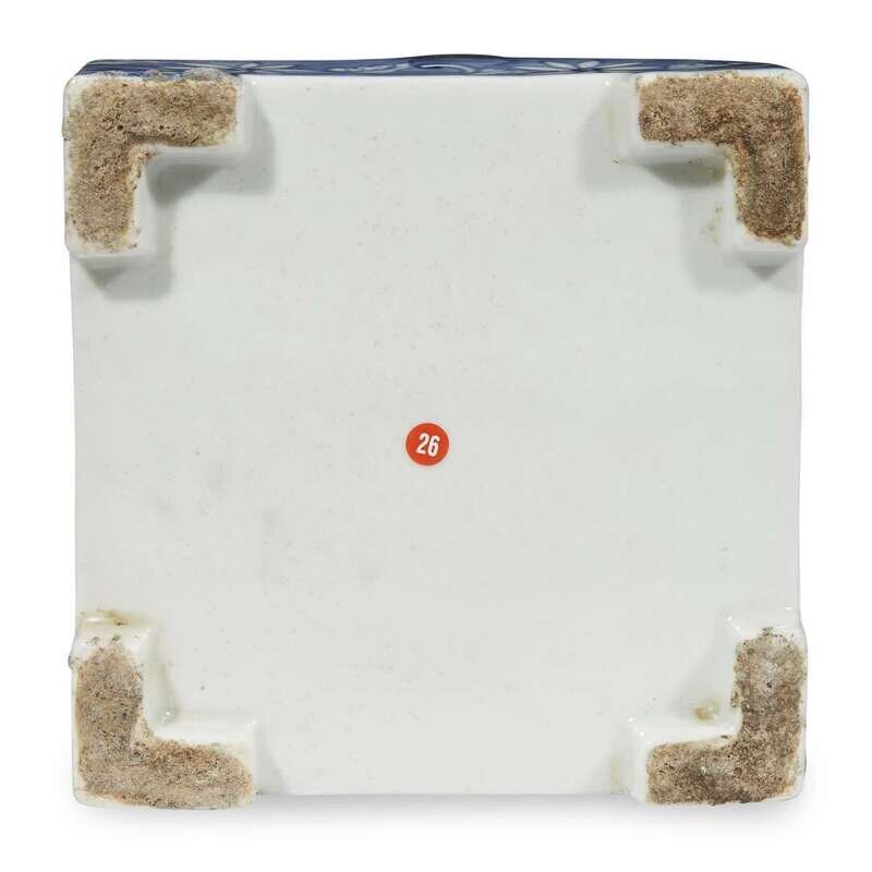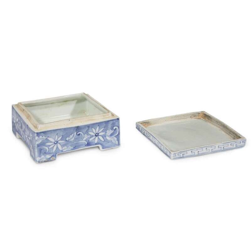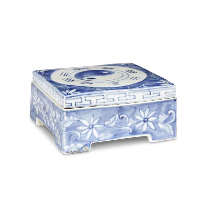 Of a fine, very even paste, raised on squared feet, the top decorated with a central yin-yang with bagua border, the blue ground with florets and scrolls, key-fret border to rim of cover, the glaze with a pale blueish-grey tint, underside and sides of feet with traces of kiln grit.