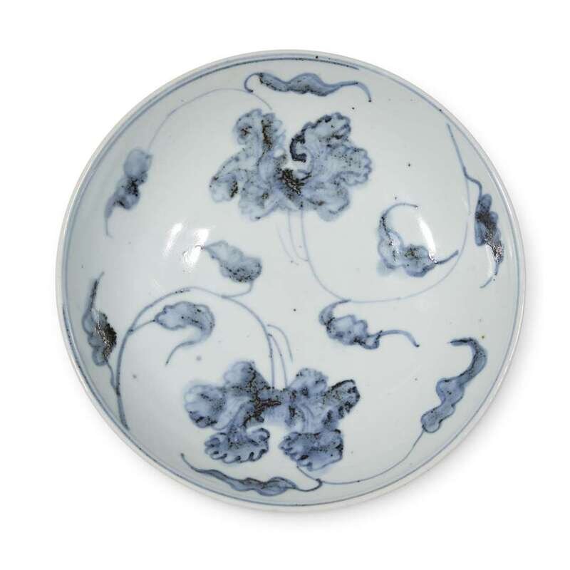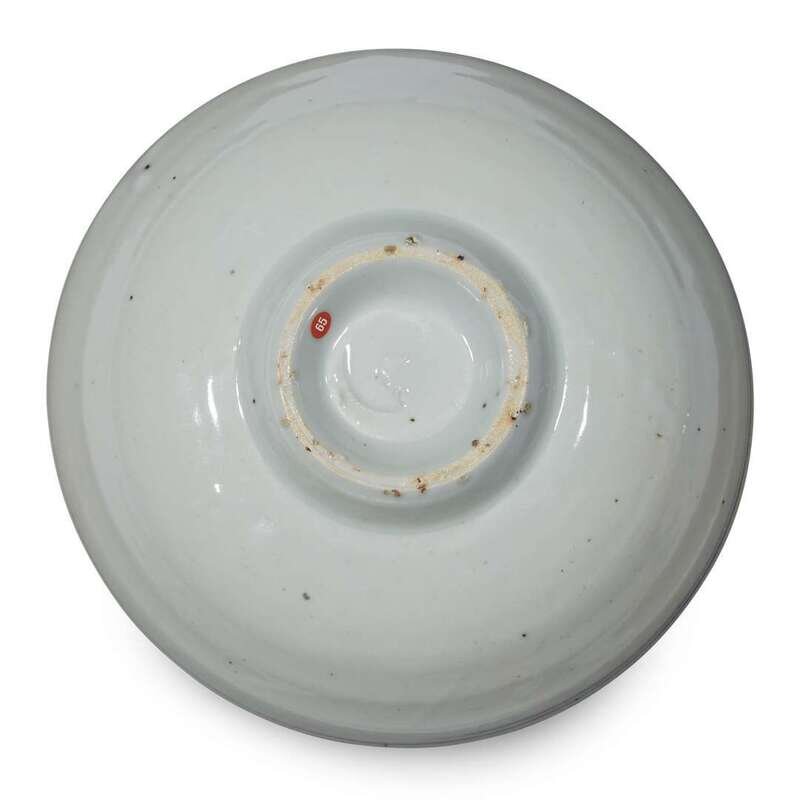 With deep curved sides, raised on a tapered circular foot, the interior decorated in a dark grey-blue with two scrolled peony sprays, the lustrous glaze with a pale blue tint, a few bits of kiln grit to the foot.