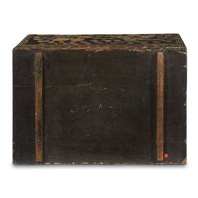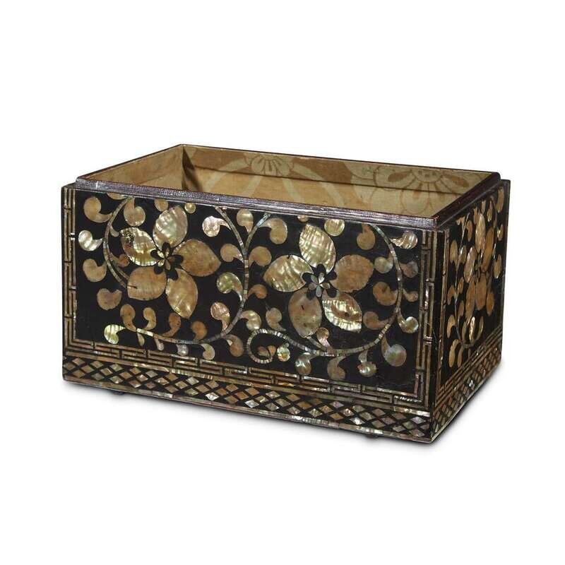 The box with beveled top, inlaid with scrolls centered by large five-petaled flowers, key fret borders, diaper band at the base, interior lined with muted yellow patterned silk.
