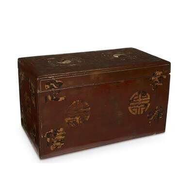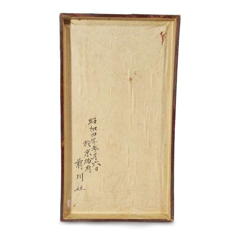 The cover decorated with two panels, each inlaid with the Eight Trigrams surrounding a yin-yang symbol; interior of cover inscribed with "showa yonnenn sangatsu muika o kyotofu maeda sei"; the sides of the body inlaid with stylized shou-characters surrounded by butterflies, shou symbols and Chinese characters representing the eight Confucian virtues.