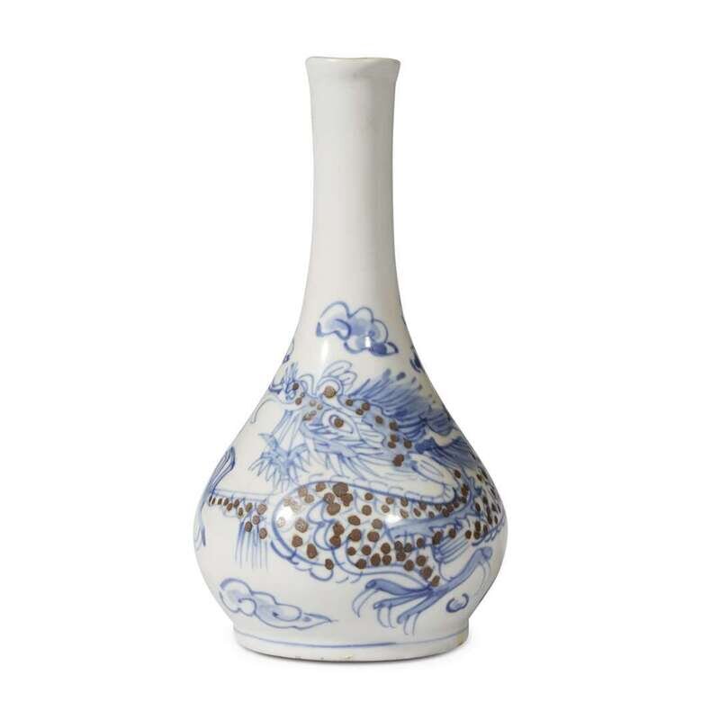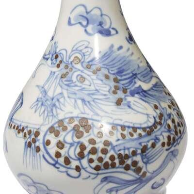 Of compressed globular form rising to a tall tapering neck and slightly everted rim, the vase decorated in underglaze cobalt blue with a four-clawed dragon with iron brown body decoration.