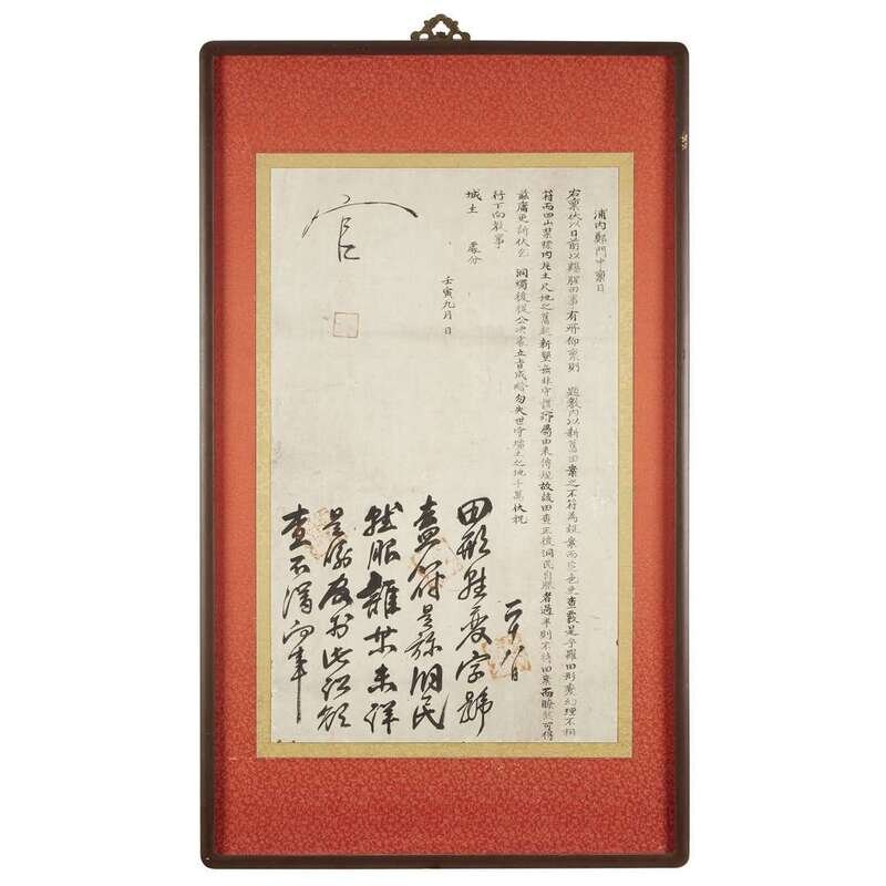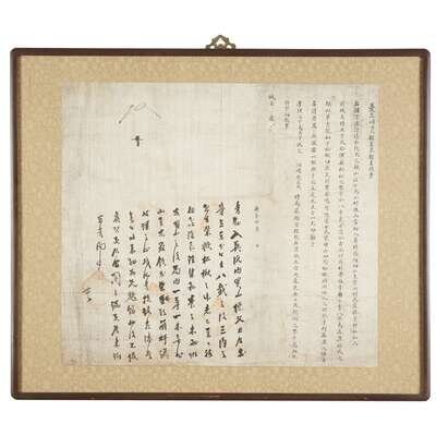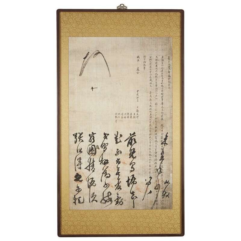 All mounted with brocade, and framed. vertical larger H: 38 1/2 in., 97.1cm; W: 23 in., 58.4cm; vertical smaller H: 25 in., 63.5cm; W: 14 1/2 in., 36.9cm; horizontal H: 26 1/4 in., 66.5cm; W: 23 1/2 in., 59.6cm