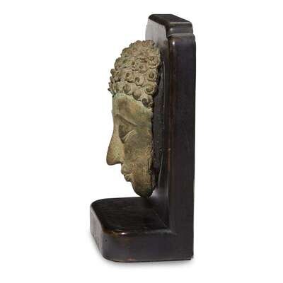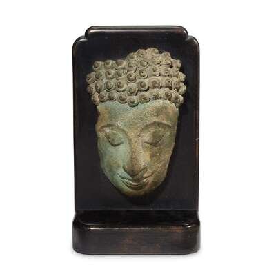 With serene experssion, the head modeled with closed lips and an arched nose beneath almond-shaped eyes; his hair arranged in tight curls, mounted on a lacquered wood base.
