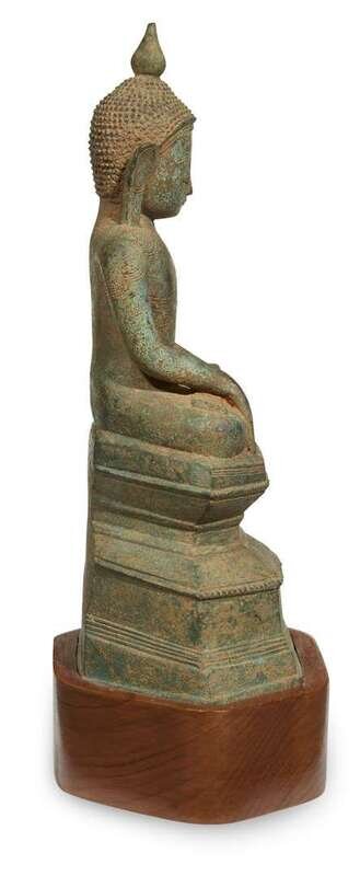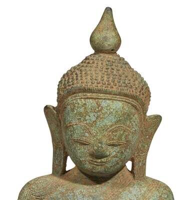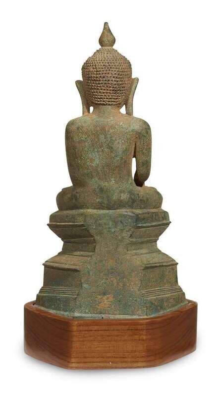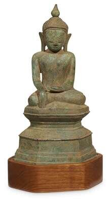 Seated in vajrasana on a shaped base, in bhumisparsa mudra; his face with serene expression, elongated earlobes, verdigris patina, later wood stand. LITERATURE: For related examples, see Otto Karow, "Burmese Buddhist Sculpture, The Johan Moger Collection, Bangkok, 2003, pp. 81, 83, nos. 65, 67.