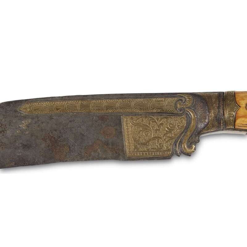 The broad single-edged steel blade with carved brass panels; the grip decorated with ivory arabesques.