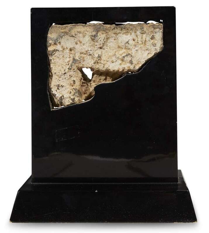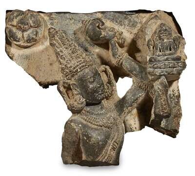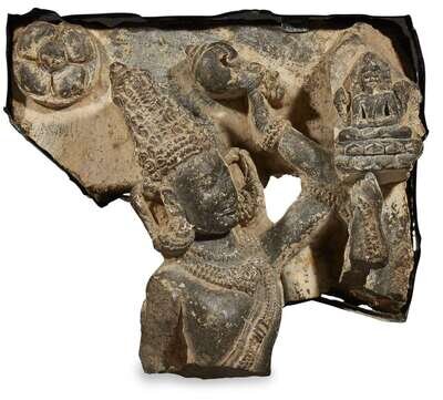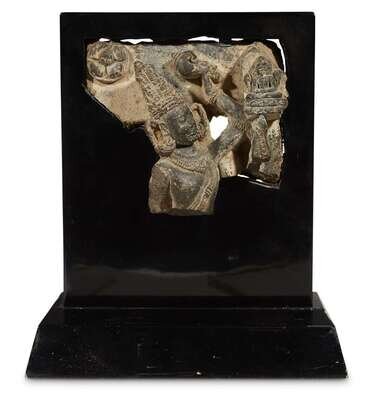 The fragment with a floret to the upper left of a bejeweled deity with hair arranged in elaborate conical chignon and left hand holdig a conch shell, to the upper right, a four-armed deity seated on a double lotus throne, mounted in a modern black-enameled wood stand.