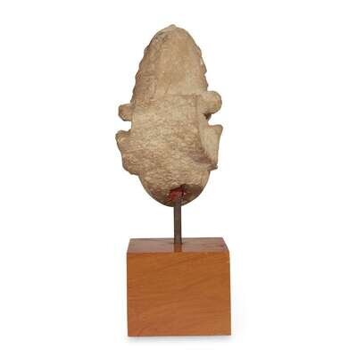 Surmounted by a tall conical headdress, the head is well-carved with serene expression. pursed lips beneath large almond-shaped eyes and his third eye centered above arched brows; with a wooden base.