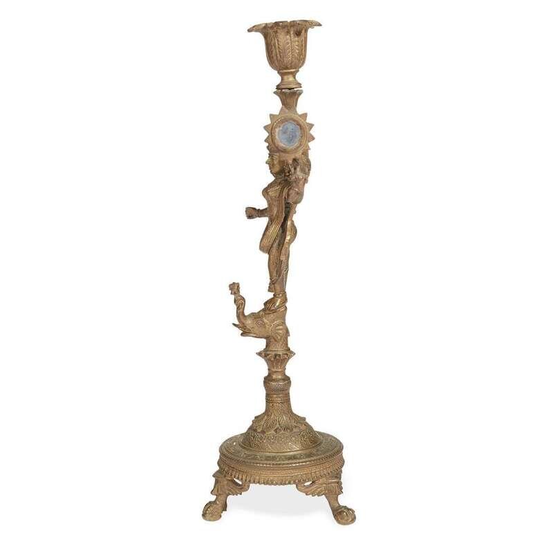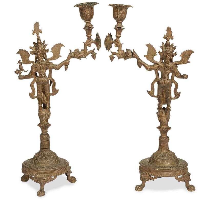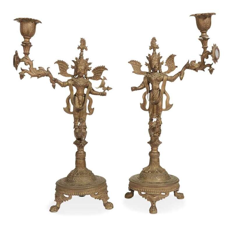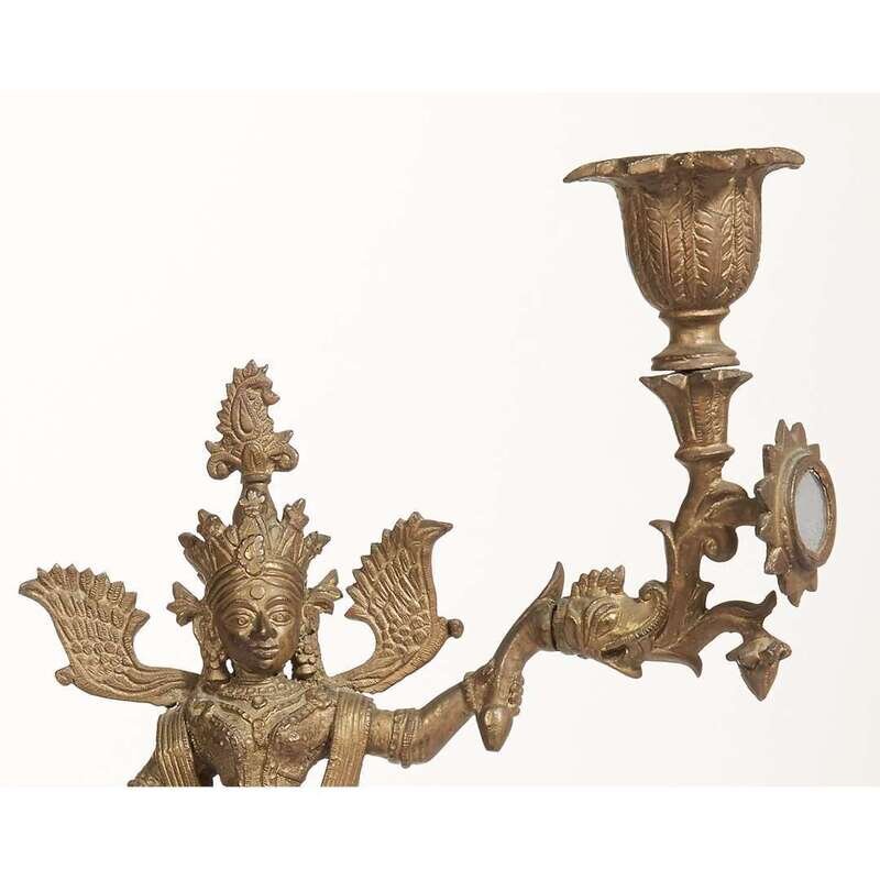 Each modeled as a winged deity wearing elaborate vestments and jewelery atop of an elephant head; one hand holds a flowering branch inset with a mirror and the other rests a bird; supported on a circular base decorated with banded floral motifs, on three paw feet.