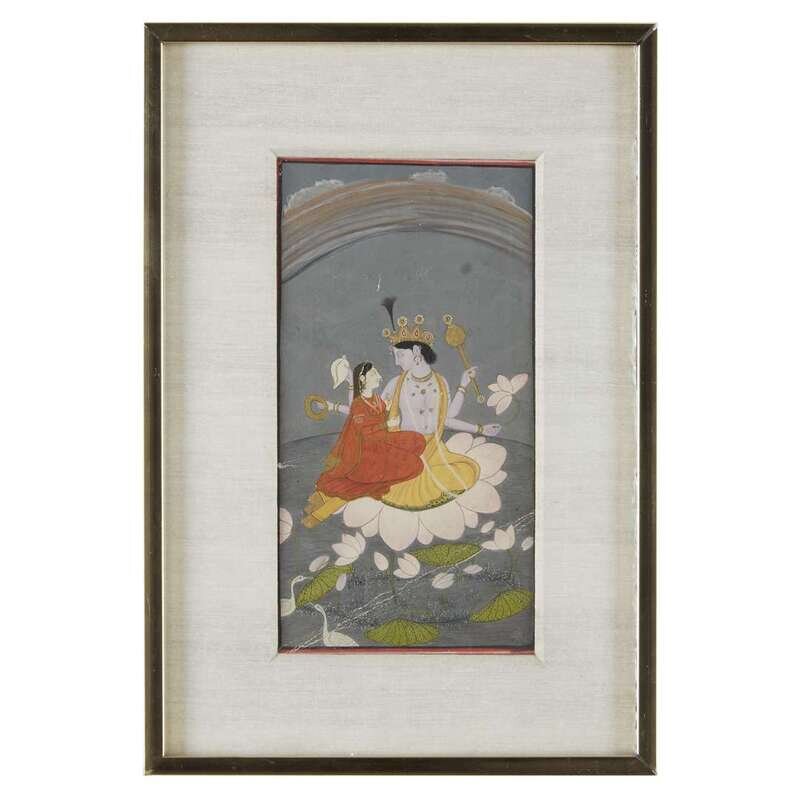 Opaque color on paper, depicting the divine couple seated on a giant lotus, among further lotus and waterbirds. Framed, matted and glazed Sight: H: 8 in., 20.3 cm; W: 4 1/2 in., 11.4 cm.