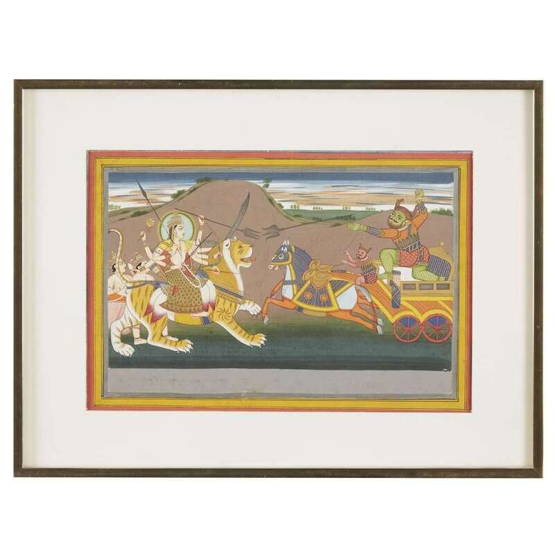Depicting the many-armed goddess on her tiger mount, with her retinue, opposing a demon and driver in a horse-drawn chariot, framed, matted and glazed. sight H: 8 in., 20.3 cm; W: 12 in., 30.5 cm