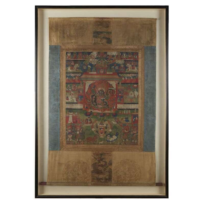 Opaque color on prepared cloth, silk brocade mount; depicting the wrathful deity, possibly a Mahakala or Yamaraja, brandishing a phurba and holding a kapala, a snake scarf entwined about him, standing in his palace, surrounded by his retinue, mounted, framed, and glazed. Approximate sight H: 24 1/2 in., 62.3cm; W: 18 3/4 in., 47.5cm; approximate overall silk mount H: 44 1/2 in., 113cm; W: 28 in., 71cm.
