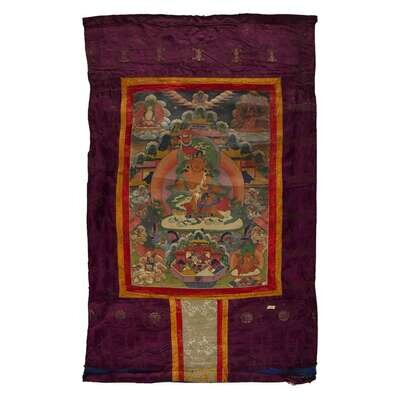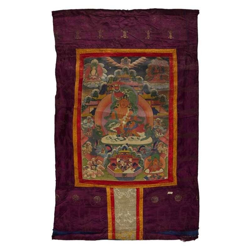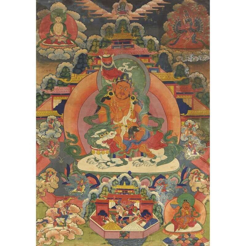 Opaque colors on cloth, within silk mounts; the deity depicted on his lion, in front of a mandorla and his palace, surrounded by subsidiary retinue.