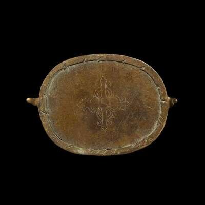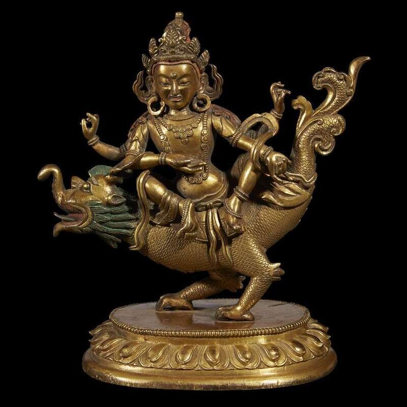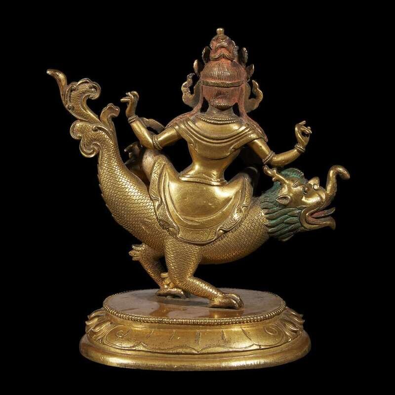 The deity with four arms, all on an oval lotus-petal base, underside incised with a double vajra. LITERATURE: The present figure may depict one of the Ten World Gods from a mandela of Baishajyaguru. For a similar two-armed figure on a makara-type mount, see the example illustrated in Marylin M. Rhie and Robert A. F. Thurman, "Wisdom and Compassion, The Sacred Art of Tibet, New York, 1991, p. 338, no. 134.