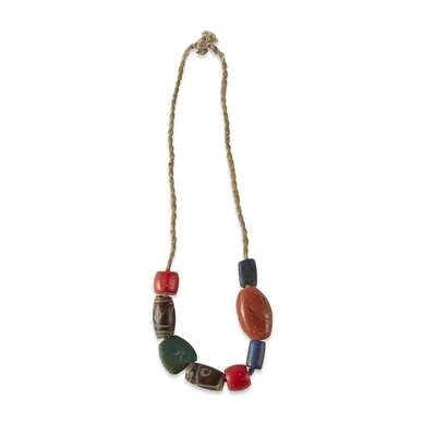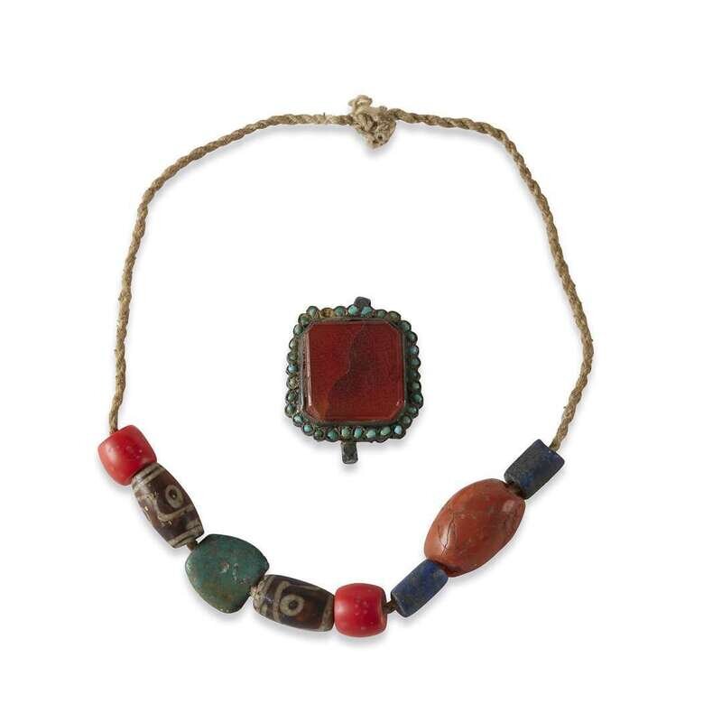 A group of Tibetan glass, turquoise and "Dzi" beads and a Mughal style incised pendant