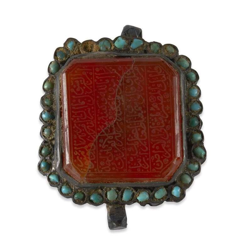 The dzi beads of glass, the carnelian-colored plaque incised with script, mounted in silver metal, set with small turquoises.