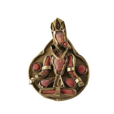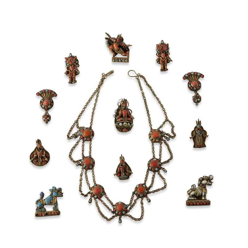 Depicting various deities, Buddhist lions, and floriforms, set with colored glass and some turquoise; comprising: a necklace, a pair of earrings, and nine pins.