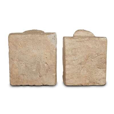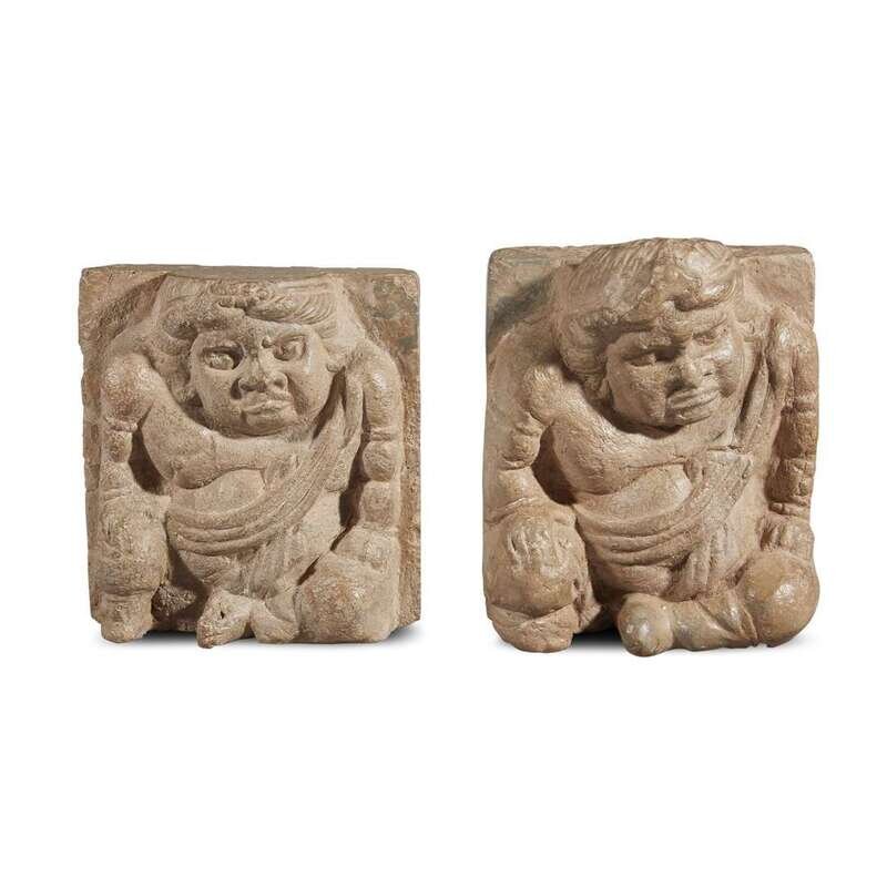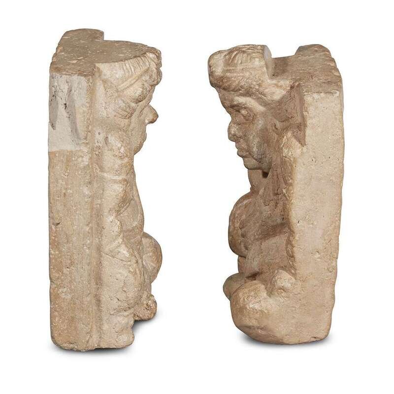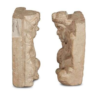 Of a fine-grained grey material, each in the form of seated dwarfed atlantes against a square back, waxy beige surface.