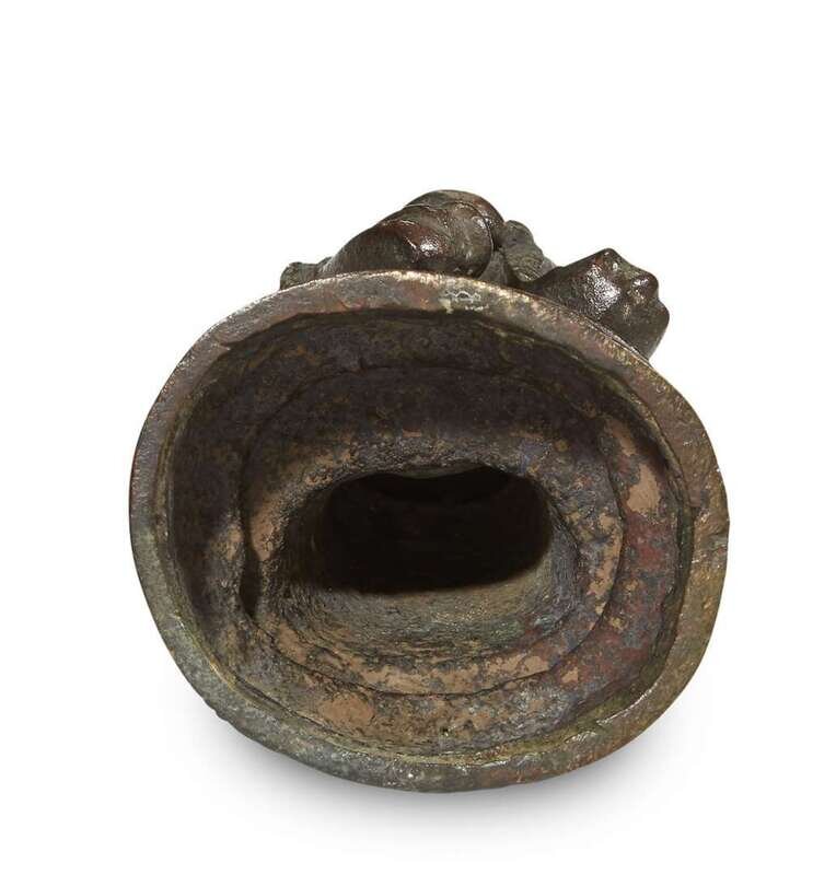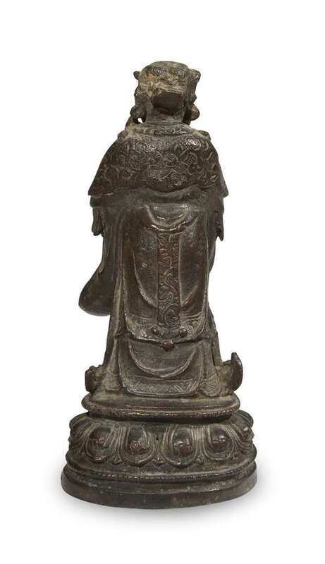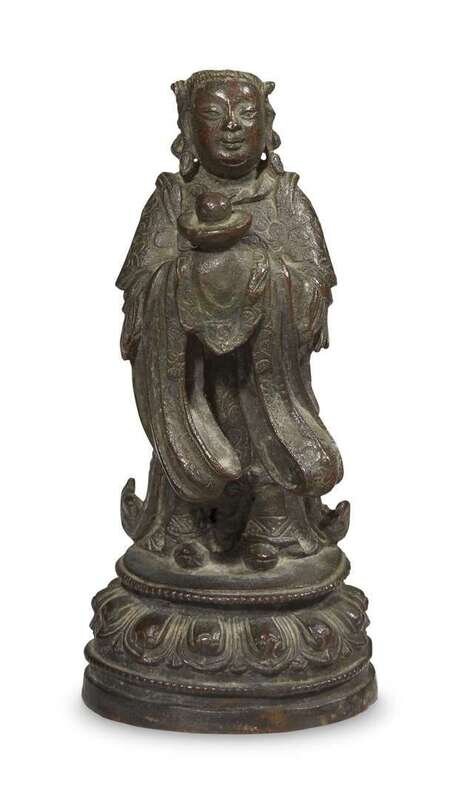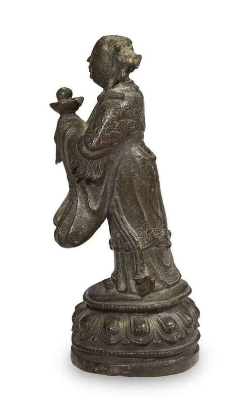 Standing atop a lotus base, the figure with hair pulled back into double loops, and wearing an elaborate layered robe ; both hands clasped and draped with a cloth to support an offering dish.