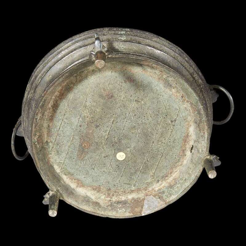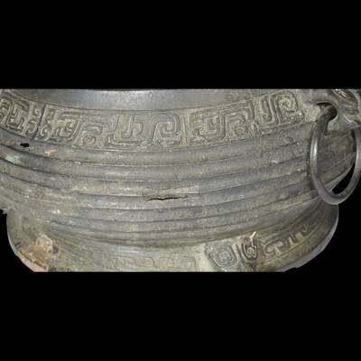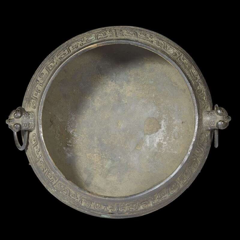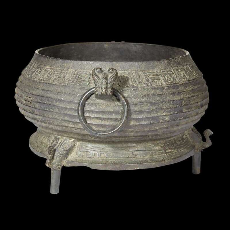 The body grooved horizontally, below a band of taotie masks and above a band of stylized graphic motifs, with a pair of beast-form handles suspending loose rings, raised on three feet with elephant heads.