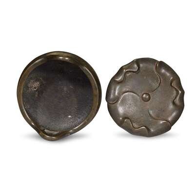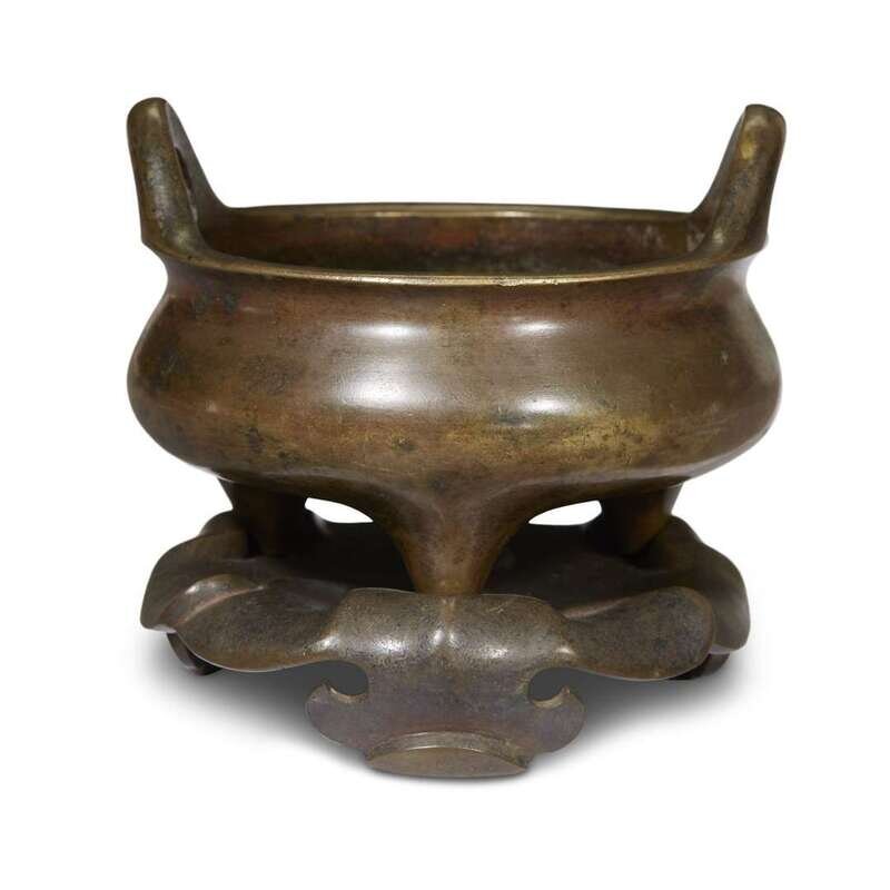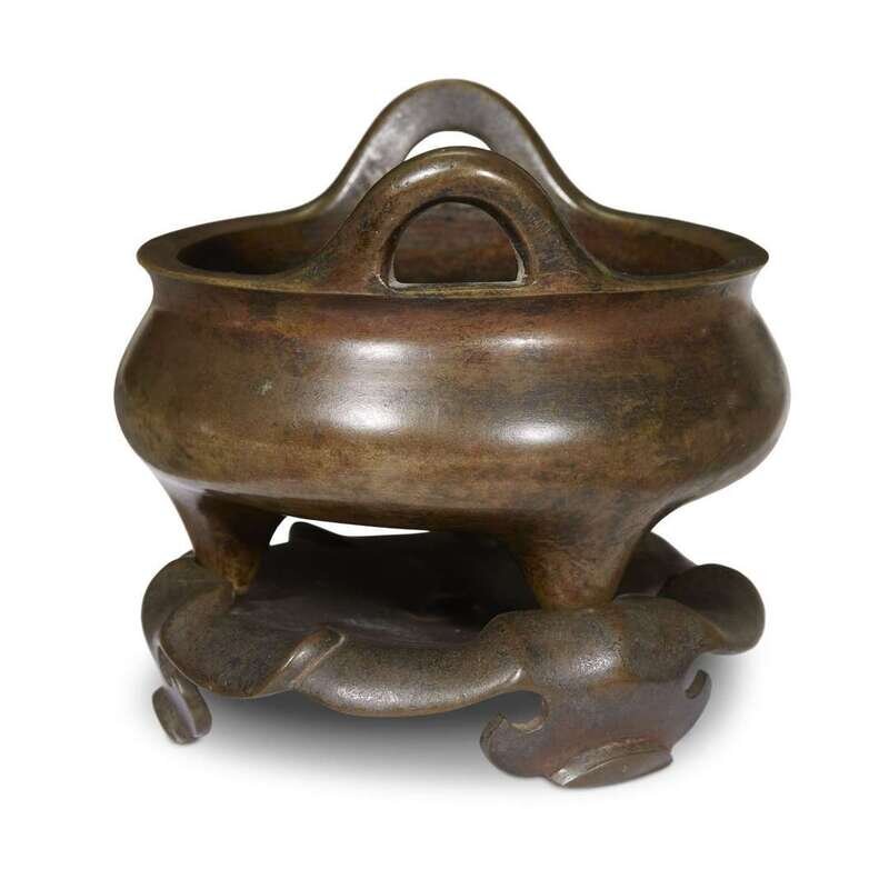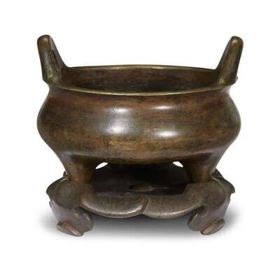 Cast with a flattened globular body, the censer supported on three short feet with two upright handles, standing on a stand in the form of three overlapping flower petals.