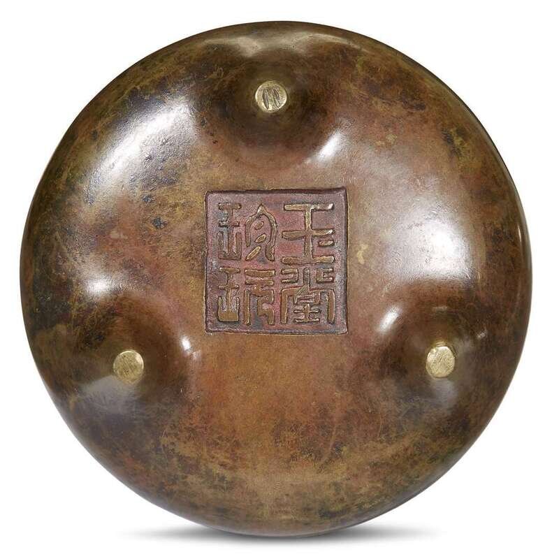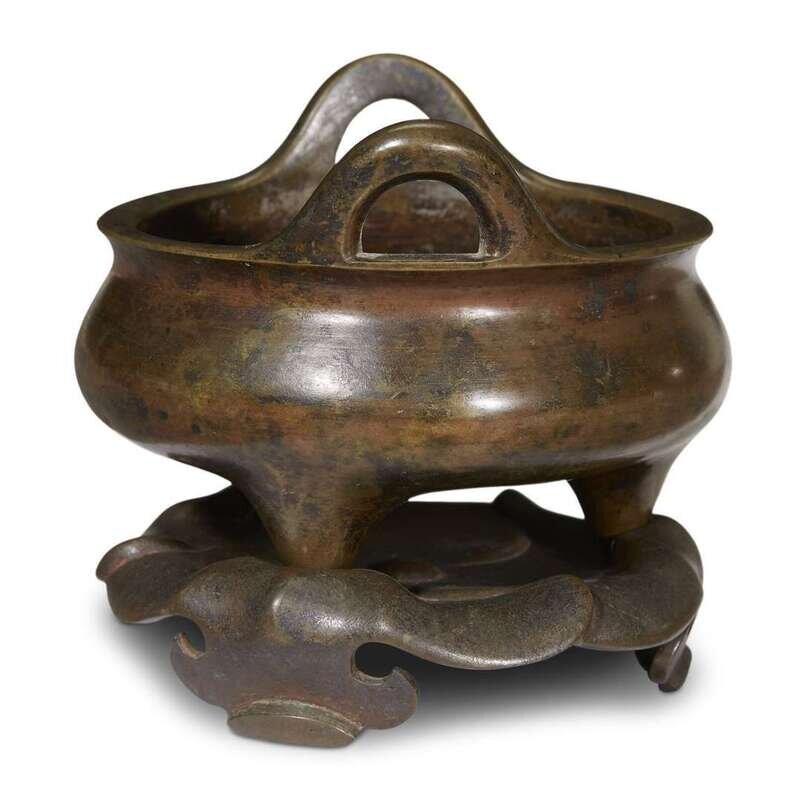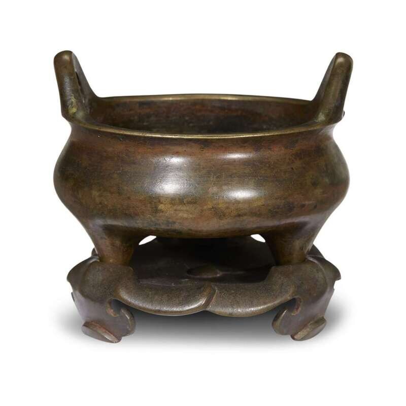 A Chinese patinated tripod bronze censer with stand, Yu Tang Zhen Wan mark 17th/18th century