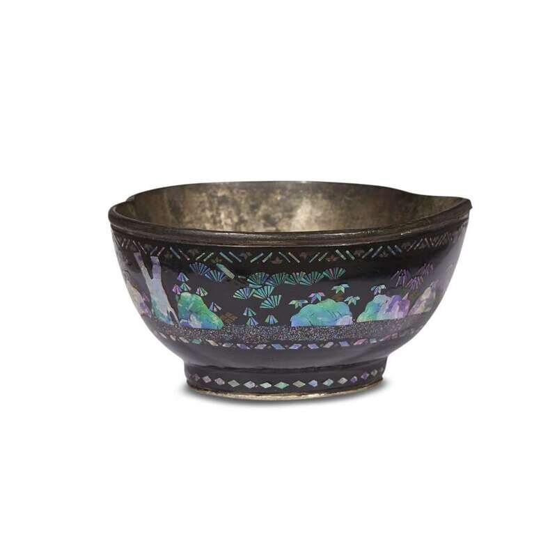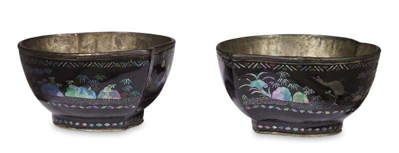 Each cup is modelled in the shape of a peach and exterior inlaid with mother-of-pearl depicting figures and animals in landscape against a black ground.