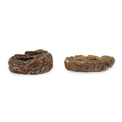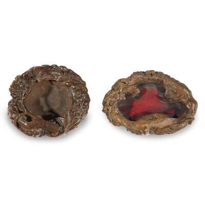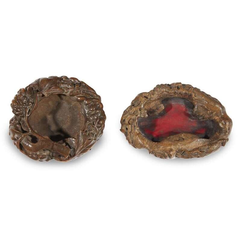 One coupe carved with intertwined branches and the interior lacquered red; the second coupe carved with several branches and an insect resting on it.