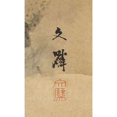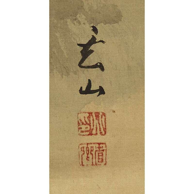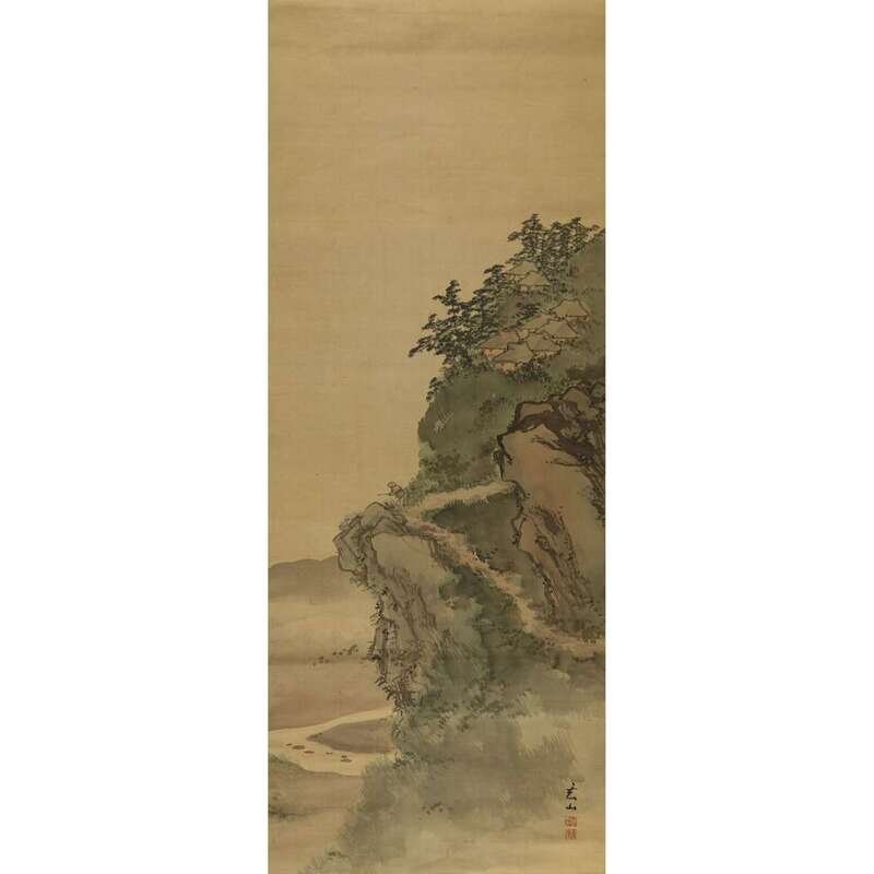 Ink and color on paper; signed with one seal lower right, mounted as a hanging scroll; Sight H: 49 in., 124.5 cm; W: 12 in., 30.5 cm; Together with: KAJINO GENZAN (d. 1939) FIGURE ON A CLIFFSIDE PATH OVERLOOKING A STREAM Ink and color on silk; mounted as a hanging scroll; inscribed and with two seals lower right. Sight H: 45 1/2 in., 115.6 cm; W: 16 in., 40.6 cm.