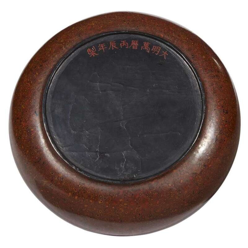 Of a shallow circular form, the surface with an elaborate network of fine marbling in various tones of colored lacquer, underside inscribed "Da Ming Wanli bingchen nianzhi" LITERATURE: For a closely related brush washer, compare the example formerly in the collection of Ian and Susan Wilson, sold at Christie's, New York, March 17, 2010, lot 1102.