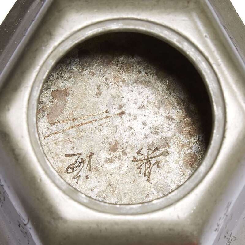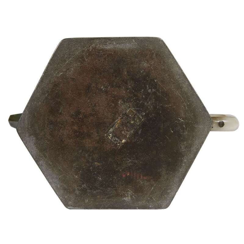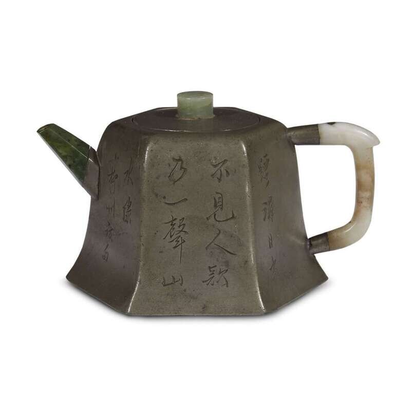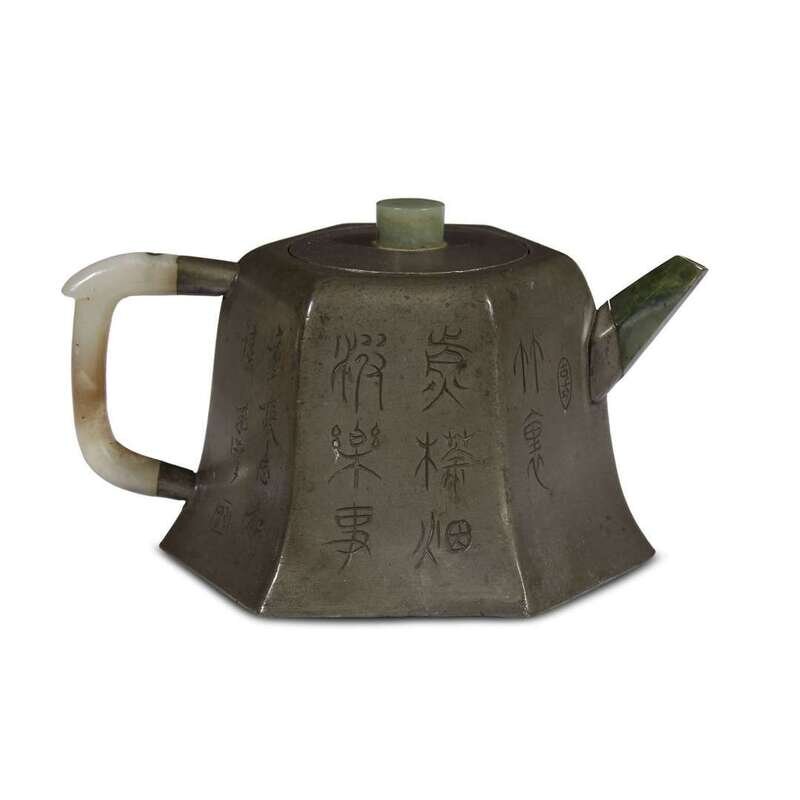 A Chinese incised pewter and jade hexagonal-section teapot and cover