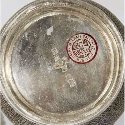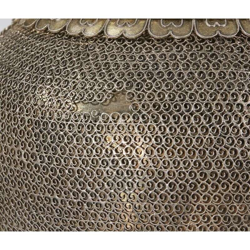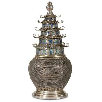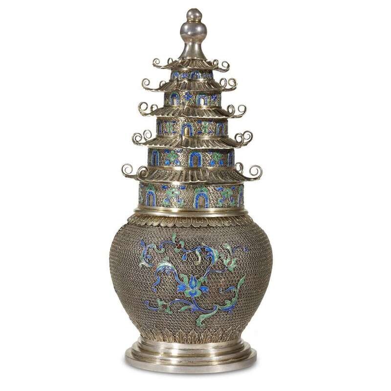 Possibly dating circa 1810 to 1835, formed as a five story pagoda with enameled architectural details, the rounded body with enameled lotus scrolls, step circular base, pesudo hallmarks to underside, makers mark WE/WE/WC.