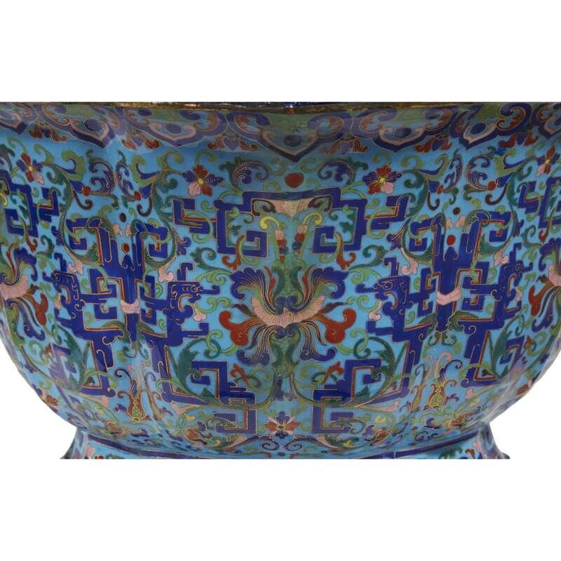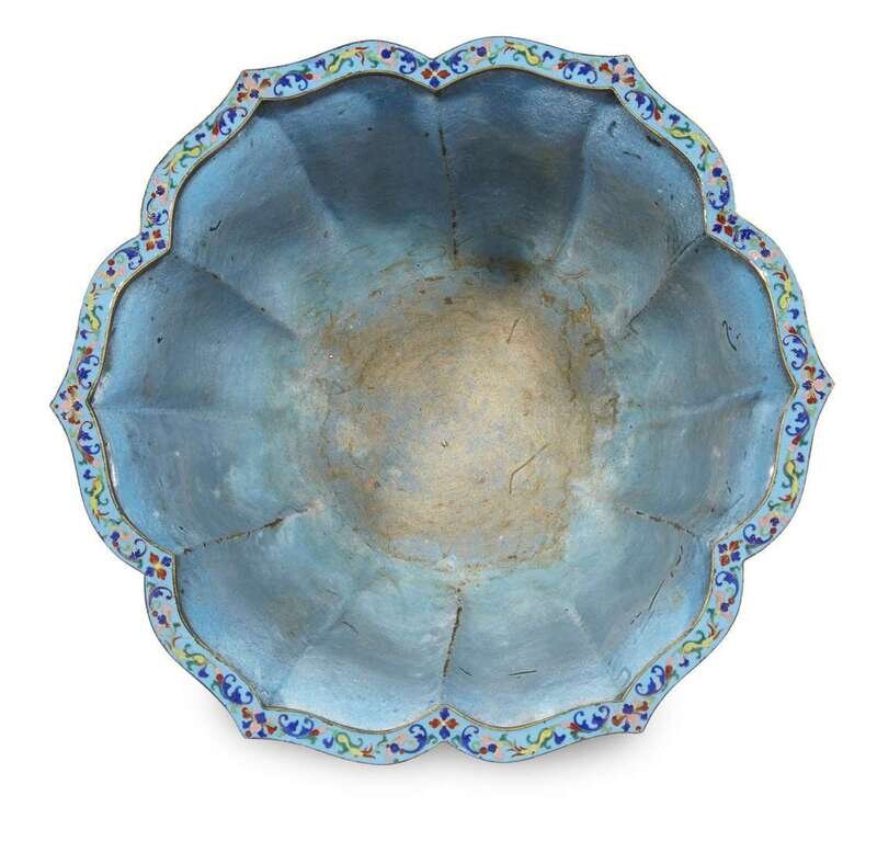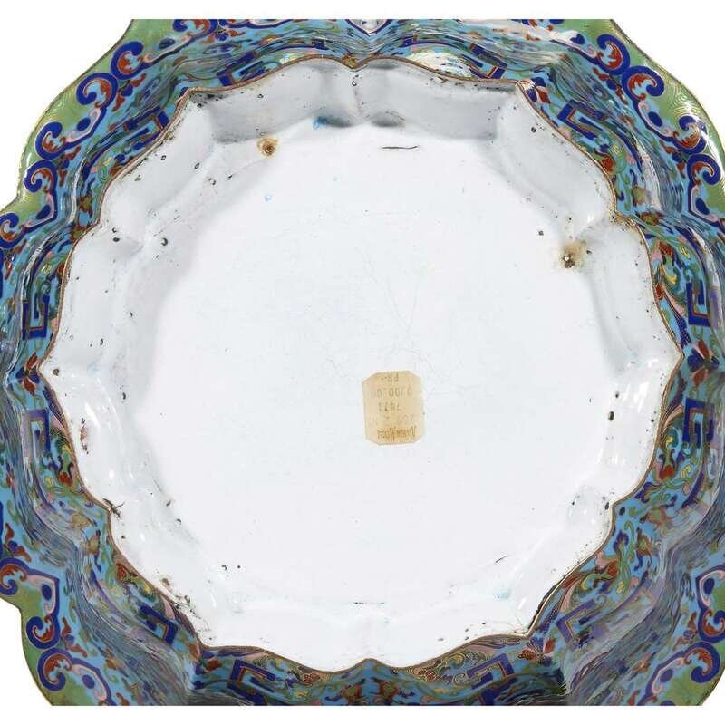 Of flared six-lobed form on conforming foot, enameled in red, cobalt blue, two shades of green and pink with stylized leafy lotus scroll and archaistic dragon-headed scrolls, all against a turquoise ground, a fine band of leiwen at the lip; the interior enameled turquoise.