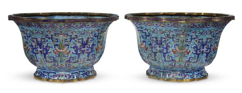 A pair of finely-decorated Chinese enameled copper floriform jardinieres mid-qing dynasty