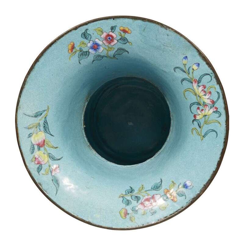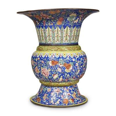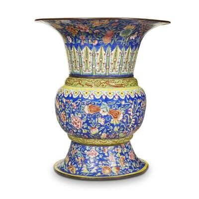 Of archaistic bronze shape, decorated with composite floral sprays and two bands of scrolling foliage in-between; the trumpet neck with a band of upright leaf lappets, all on deep blue enamel ground; interior with turquoise ground.